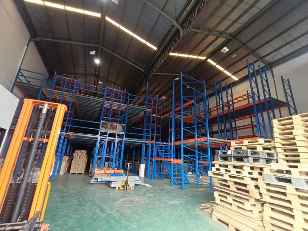 Solusi terbaik untuk masalah ini adalah menggunakan mezzanine racking system. Sistem ini memungkinkan penambahan tingkat penyimpanan secara vertikal sehingga kapasitas gudang meningkat signifikan tanpa perlu perluasan bangunan. Dengan mezzanine, Anda bisa memanfaatkan ruang kosong di atas rak untuk penyimpanan tambahan, ruang kerja, atau bahkan area pengemasan.